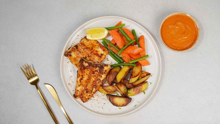 1. Peri-Peri Fish with Baked Potatoes & Glazed Carrots